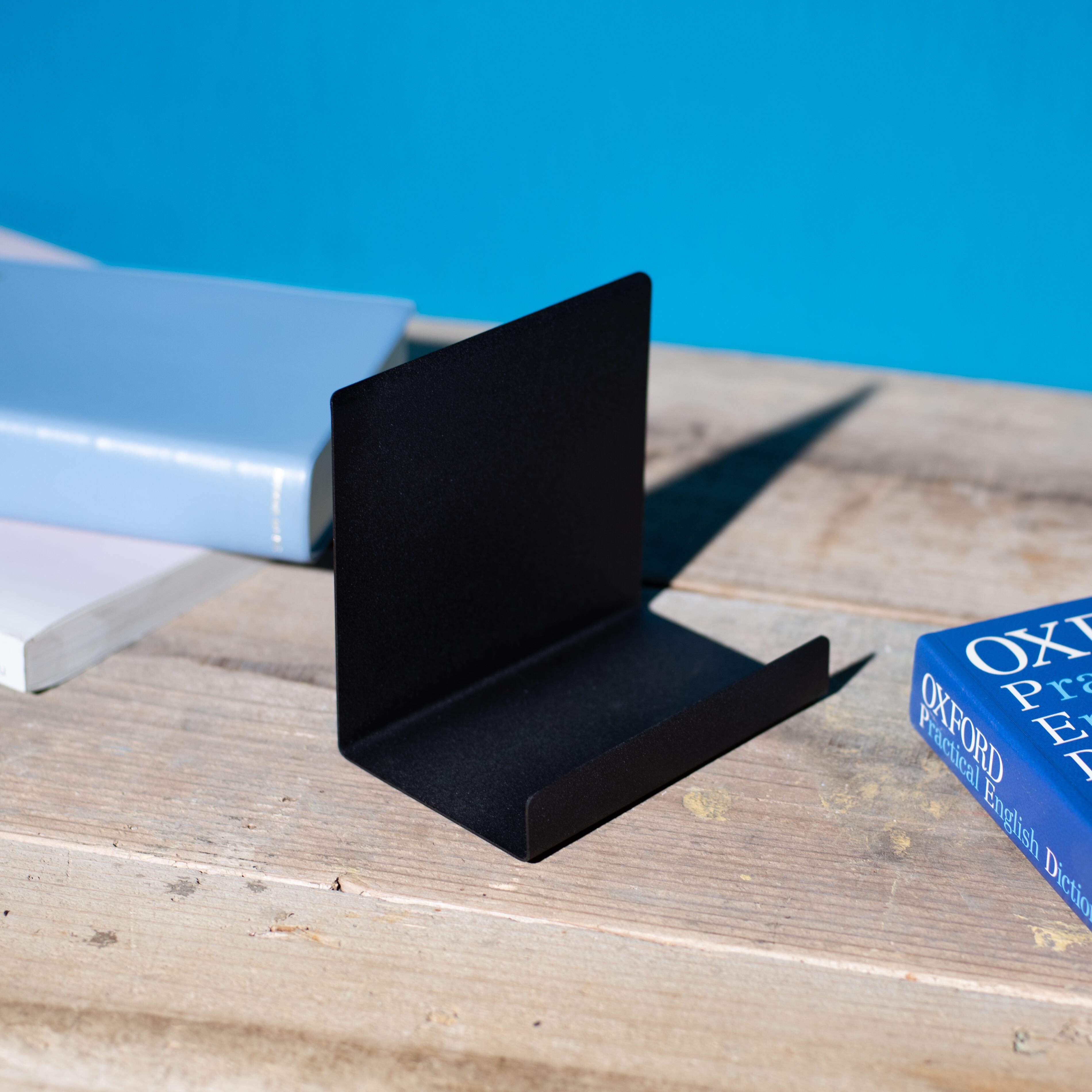艶のないマッドなブラックの仕上げは、どんな本棚やデスクにもフィットし、スタイリッシュな印象を与えます。書籍をしっかりと支え、整理整頓された空間を演出する役割を果たします。両端が立ち上がっているデザインのおかげで、ノートPCなども安定して立てかけることができるのが魅力です。